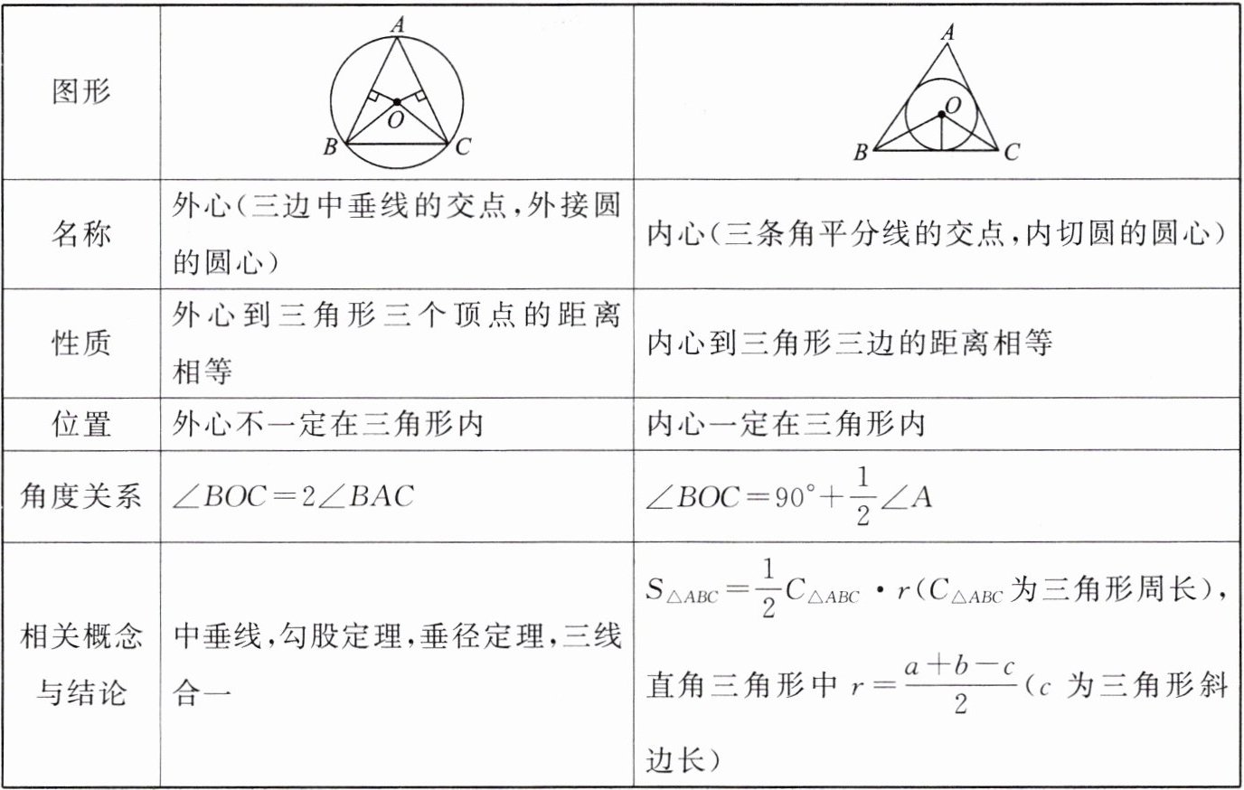 |角度关系|$\angle BOC= 2\angle BAC$|$\angle BOC= 90^{\circ}+\frac{1}{2}\angle A$|