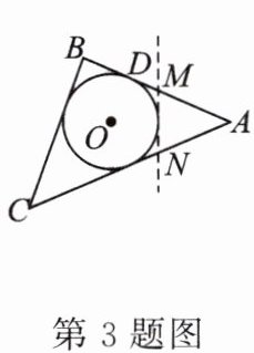3.如图,$\triangle ABC$是一张三角形纸片,$\odot O$是它的内切圆,点D是其中一个切点.已知$AD= 6\ cm$,小明准备用剪刀沿着与$\odot O$相切的一条直线MN剪下一块三角形($\triangle AMN$),则剪下的$\triangle AMN$的周长是( ).