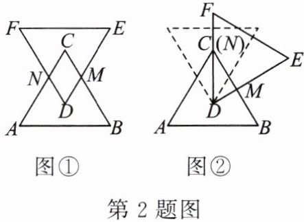 2.如图①,有两个全等的正三角形ABC和正三角形DEF,点D,C分别为$\triangle ABC$,$\triangle DEF$的内心.固定点D,将$\triangle DEF$顺时针旋转,使得DF经过点C,如图②,则图①中四边形CNDM与图②中$\triangle CDM$面积的比为( ).