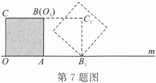 7. 如图,把边长为1的正方形纸片OABC放在直线m上,OA边在直线m上,然后将正方形纸片绕着顶点A按顺时针方向旋转90°,此时,点O运动到了点$O_1$处(即点B处),点C运动到了点$C_1$处,点B运动到了点$B_1$处.再将正方形纸片$AO_1C_1B_1绕点B_1$按顺时针方向旋转90°……按上述方法经过4次旋转后,顶点O经过的路径长为______;经过61次旋转后,顶点O经过的路径长为______.