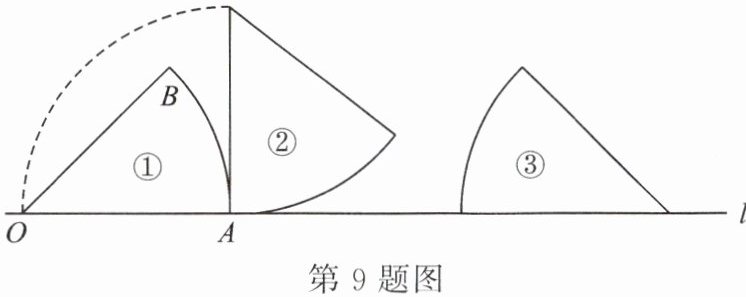 9.如图,放置在直线l上的扇形OAB,由①滚动(无滑动)到②,再由②滚动到③.若半径OA= 2,∠AOB= 45°,则点O所经过的路径的长是( ).
