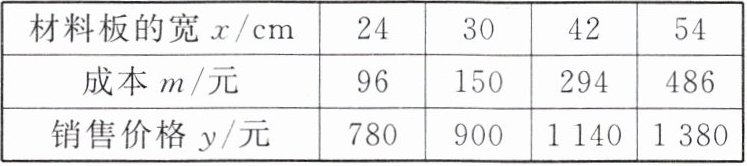 19.某工厂生产一种矩形材料板,其长、宽之比为$3:2$.每张材料板的成本$m$(单位:元)与它的面积(单位:$cm^{2}$)成正比例,每张材料板的销售价格$y$(单位:元)与其宽$x$(单位:$cm$)之间满足我们学习过的一次函数和二次函数关系中的一种.下表记录了该工厂生产、销售该材料板的一些数据.