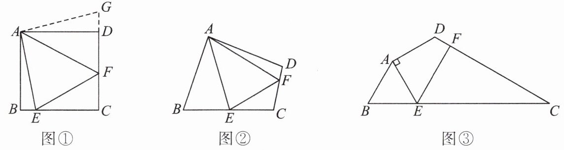 10.(1)如图①,点$E$,$F分别在正方形ABCD的边BC$,$CD$上,$\angle EAF= 45^{\circ}$.把$\triangle ABE绕点A逆时针旋转90^{\circ}至\triangle ADG$,从而发现$EF= BE+DF$,请利用图①证明上述结论.