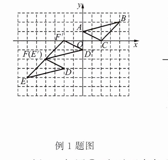 例1 如图,在平面直角坐标系中,将$ \triangle DEF $先向上平移2个单位长度,再向右平移2个单位长度得$ \triangle D'E'F' $,则$ \triangle D'E'F' 和 \triangle ABC $关于原点对称吗?