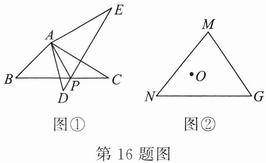 16. 问题背景:如图①,将△ABC绕点A逆时针旋转60°得到△ADE,DE与BC交于点P,可推出结论:PA+PC= PE.
