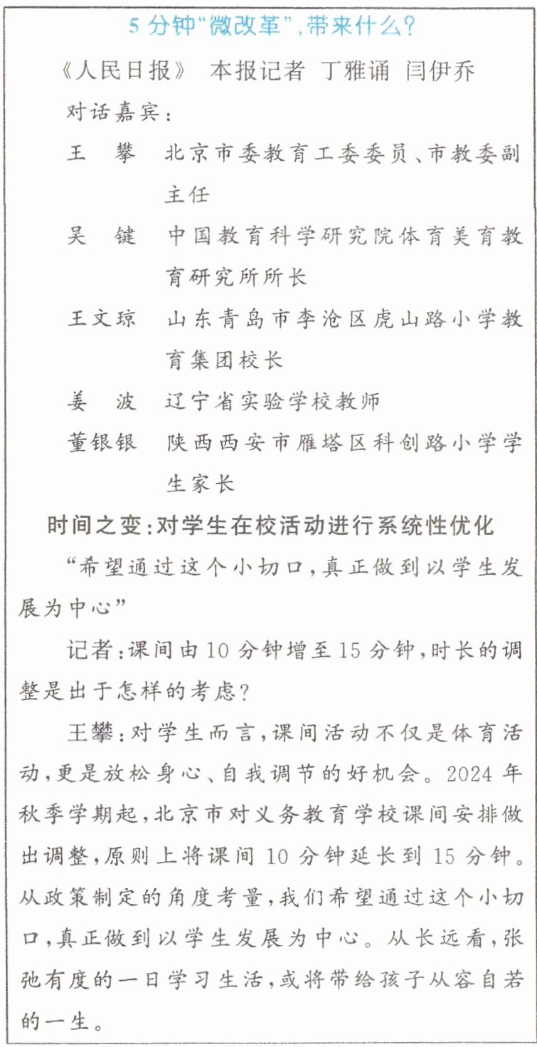 王攀:对学生而言,课间活动不仅是体育活动,更是放松身心、自我调节的好机会。2024 年秋季学期起,北京市对义务教育学校课间安排做出调整,原则上将课间 10 分钟延长到 15 分钟。从政策制定的角度考量,我们希望通过这个小切口,真正做到以学生发展为中心。从长远看,张弛有度的一日学习生活,或将带给孩子从容自若的一生。