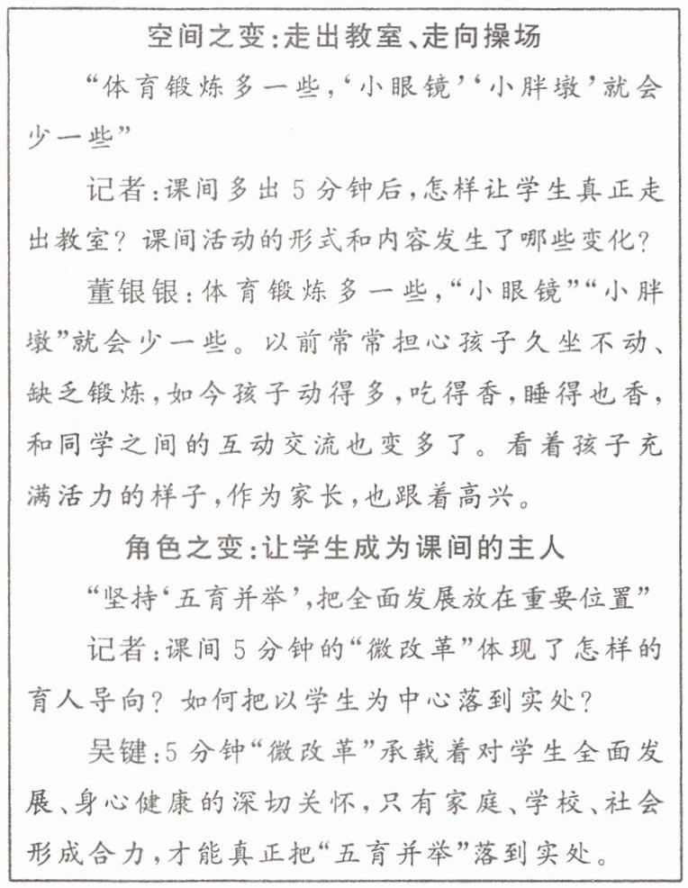记者:课间 5 分钟的“微改革”体现了怎样的育人导向? 如何把以学生为中心落到实处?