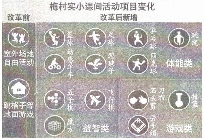 记者:课间多出 5 分钟后,怎样让学生真正走出教室? 课间活动的形式和内容发生了哪些变化?