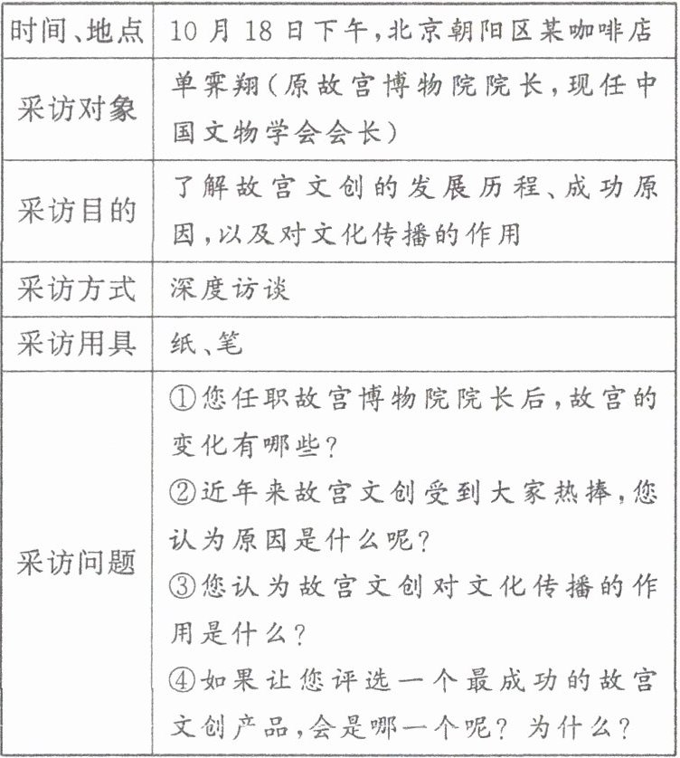 A. 采访地点不应该选择咖啡店,如果可以,最好选在故宫博物院里。