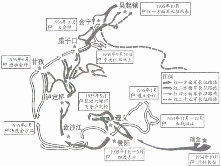 (2)“红军不怕远征难,万水千山只等闲。”《红星照耀中国》中斯诺向全世界报道了红军长征这一举世无双的军事壮举。以下是红军二万五千里长征路线图,请结合路线图中的事件具体谈谈你对长征精神的理解。