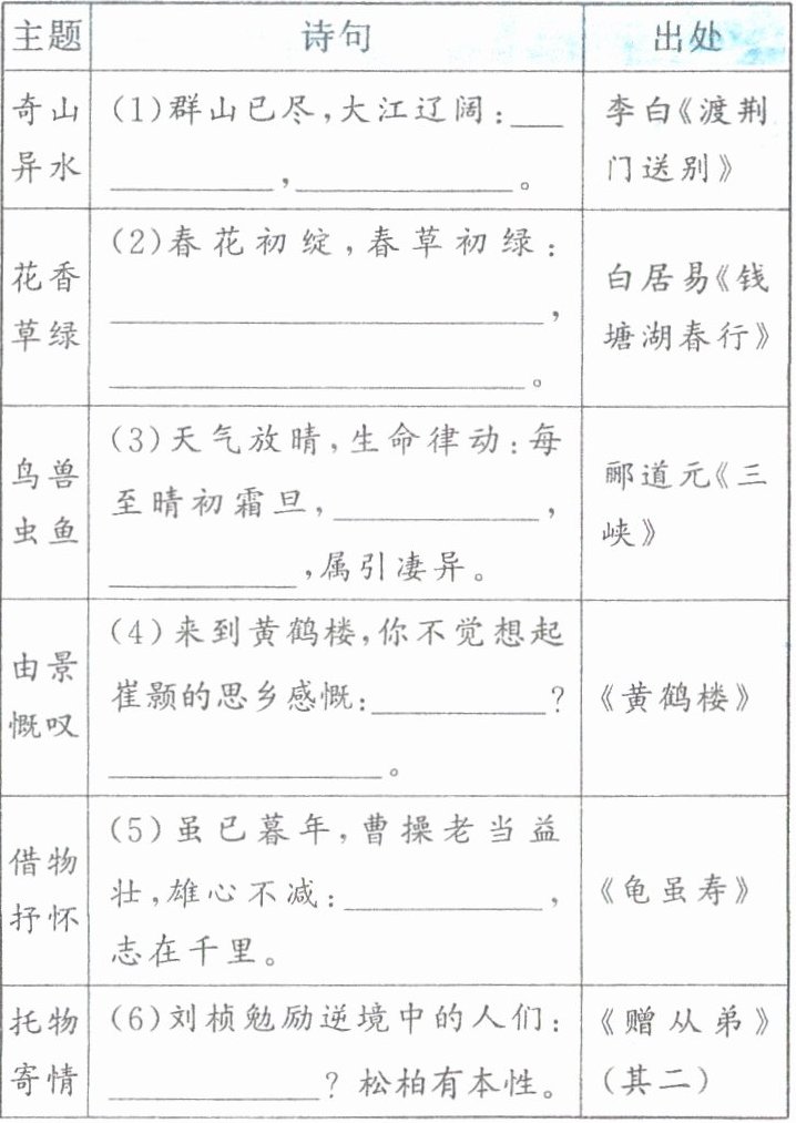 1.(1)山随平野尽 江入大荒流 (2)乱花渐欲迷人眼 浅草才能没马蹄 (3)林寒涧肃 常有高猿长啸 (4)日暮乡关何处是 烟波江上使人愁 (5)老骥伏枥 (6)岂不罹凝寒