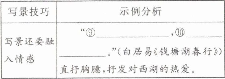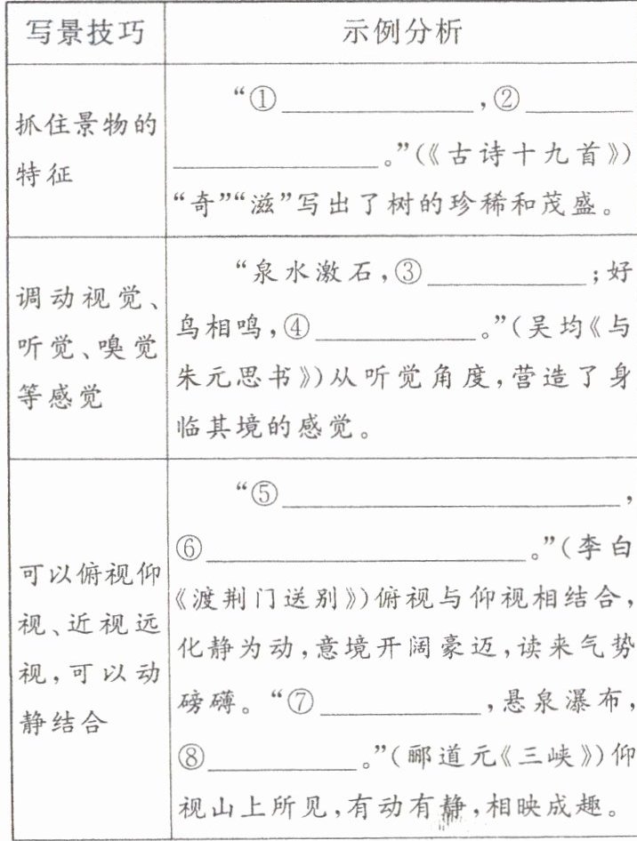 1. 古诗文中一些写景技巧值得借鉴。请根据积累完成下表。(10 分)