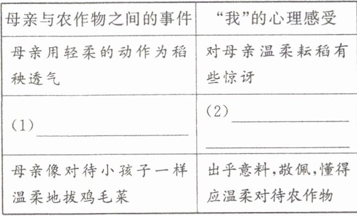 6. 初读,内容梳理。请梳理文章所写的母亲和农作物之间的三件亲密事件,以及“我”的心理变化过程,完成下面表格。(4 分)