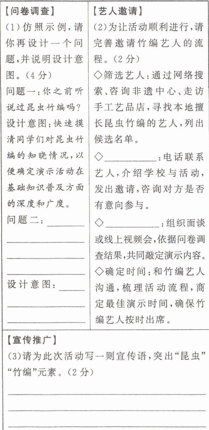 如图所示,竹编这项传统技艺常常巧妙融入昆虫元素,编织出各式各样的昆虫造型,展现其独特魅力。学校拟举办昆虫竹编技艺演示活动,请你完善活动的准备事宜。