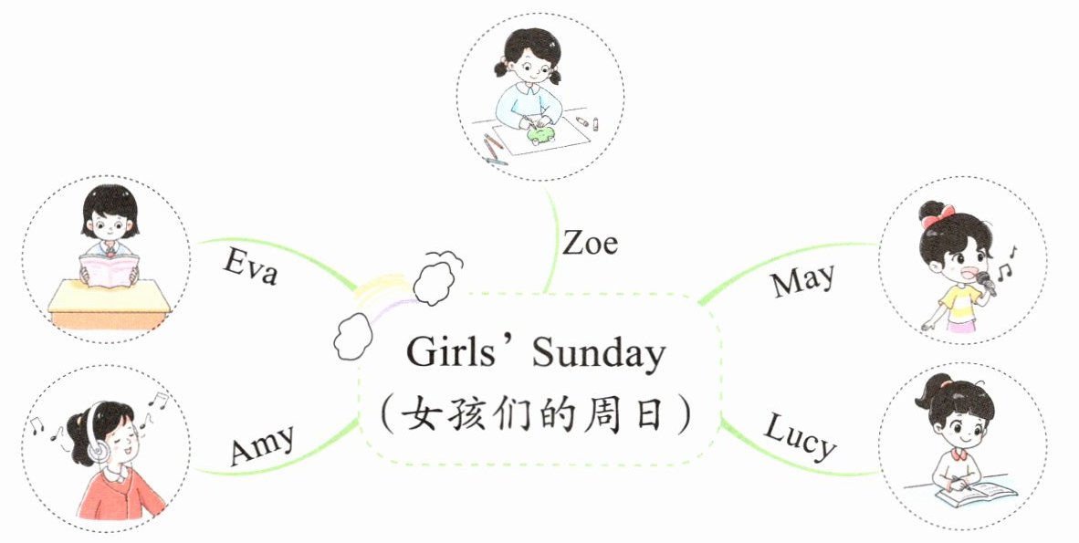今天是周日,Zoe和她的朋友们都在做什么呢?看图,将人名与相应的活动连线。