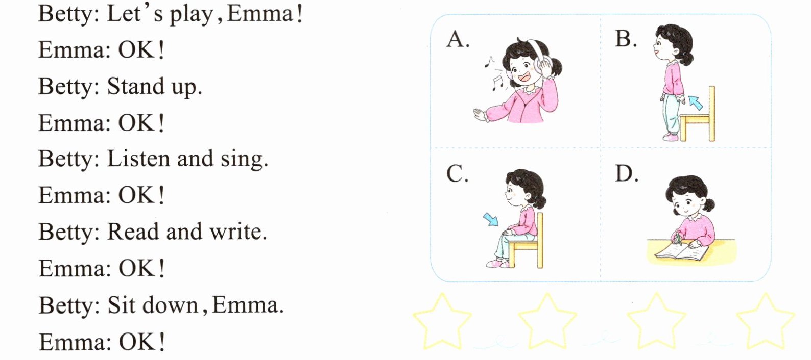 三 Betty和Emma正在玩指令游戏。阅读对话,根据对话内容为图片排序。