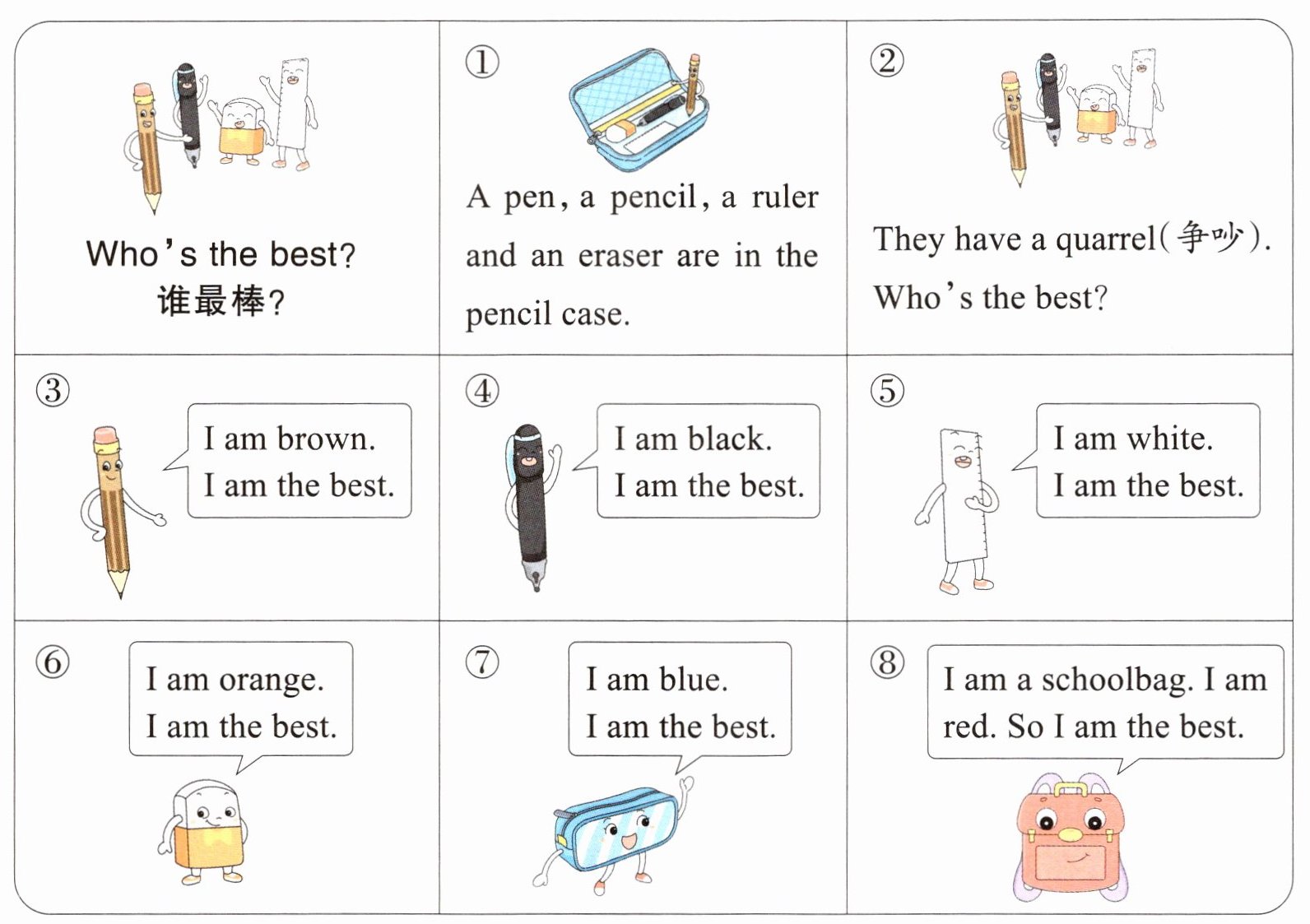| Who's the best? 谁最棒?|① A pen, a pencil, a ruler and an eraser are in the pencil case.|② They have a quarrel(争吵). Who's the best?|