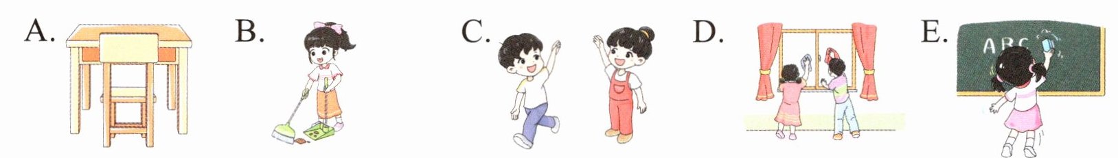 We clean our classroom today. Peter cleans the 1.______. Lucy and I 2.______ the floor. Wendy and Cathy 3.______ the chairs 4.______ the desks. Now the 5.______ is clean. We are all happy.
