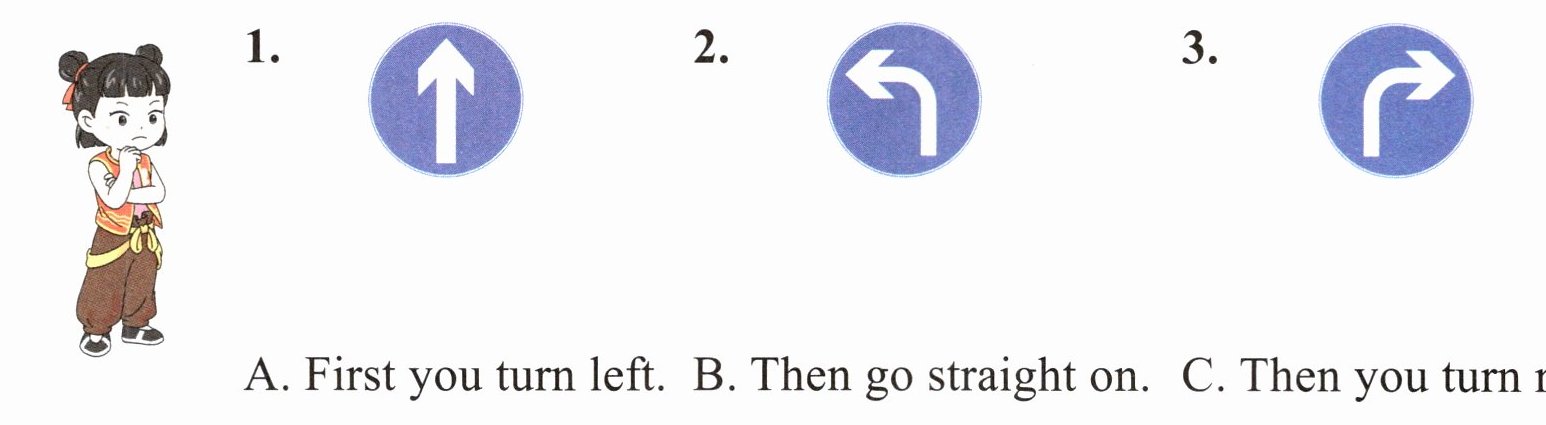 A. First you turn left. B. Then go straight on. C. Then you turn right.