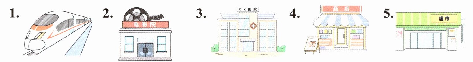 1. train 2. cinema 3. hospital 4. shop 5. supermarket