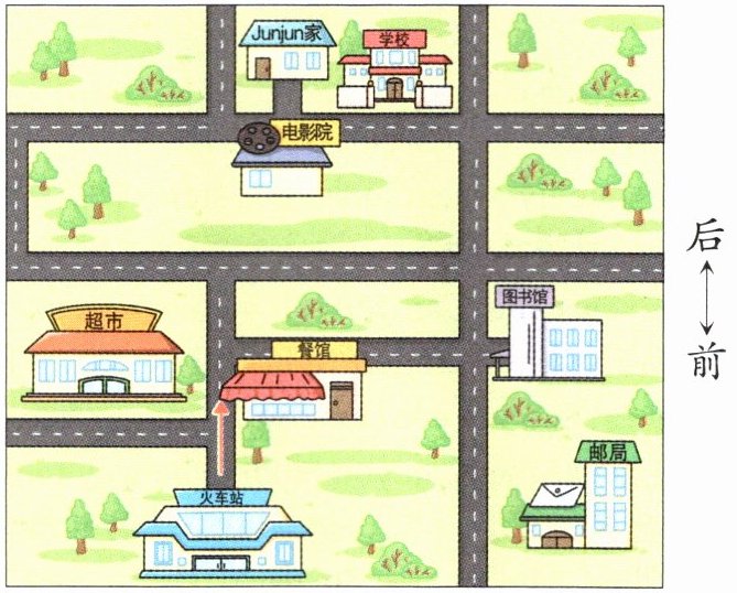 三 〔教材变式题〕Read, look and write. Binbin 在火车站,他打算去Junjun家做客。根据图片提示补全短文,告诉他去Junjun家的路线吧。