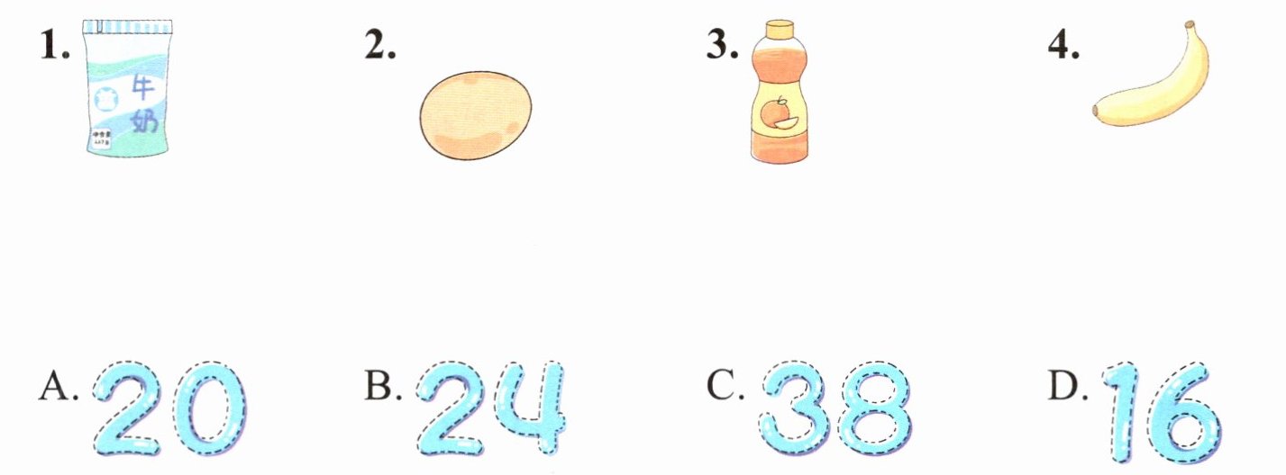 任务一:1—B 2—A 3—D 4—C 任务二:1. T 2. F 【解析】由文中“She buys twenty eggs. They're sixty yuan.”可知,大象妈妈买了二十个鸡蛋,花费60元,故本题描述错误。3. F 4. F 5. T 【解析】由短文最后两句“And she buys some ice cream. It's twelve yuan.”可知,冰激凌一共12元,故本题描述正确。