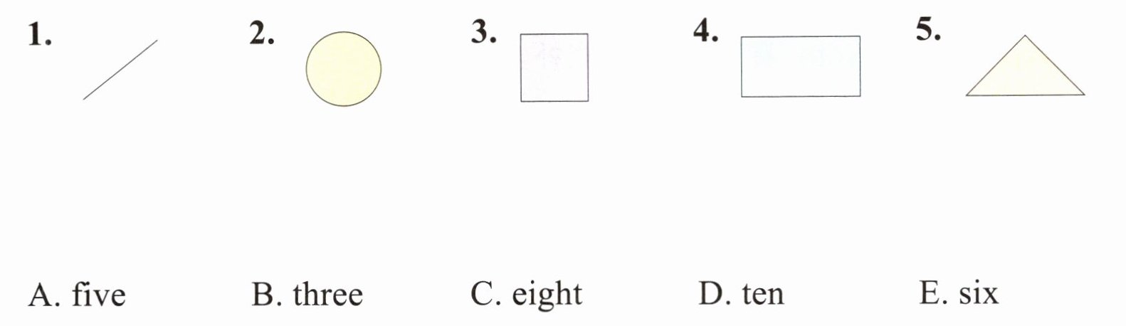 一 Listen and match. 听录音,根据所听内容,将下列形状与相应的数字连线。