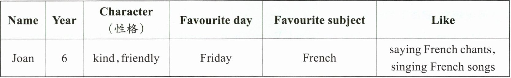 I'm Joan. I'm 12 years old. I have got black hair and eyes. I'm kind and 1. ______. I'm in Year 6 this year. My favourite day is 2. ______. Because we have got 3. ______ on that day. It's my favourite subject. In French, I like 4. ______ and singing French songs. I also like English. It's interesting. I think school is great fun.