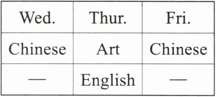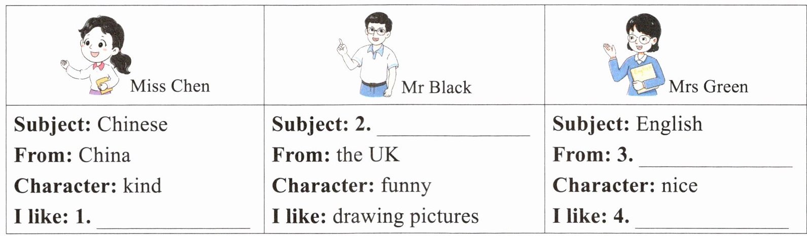 |Subject: ChineseFrom: ChinaCharacter: kindI like: 1. ______|Subject: 2. ______From: the UKCharacter: funnyI like: drawing pictures|Subject: EnglishFrom: 3. ______Character: niceI like: 4. ______|