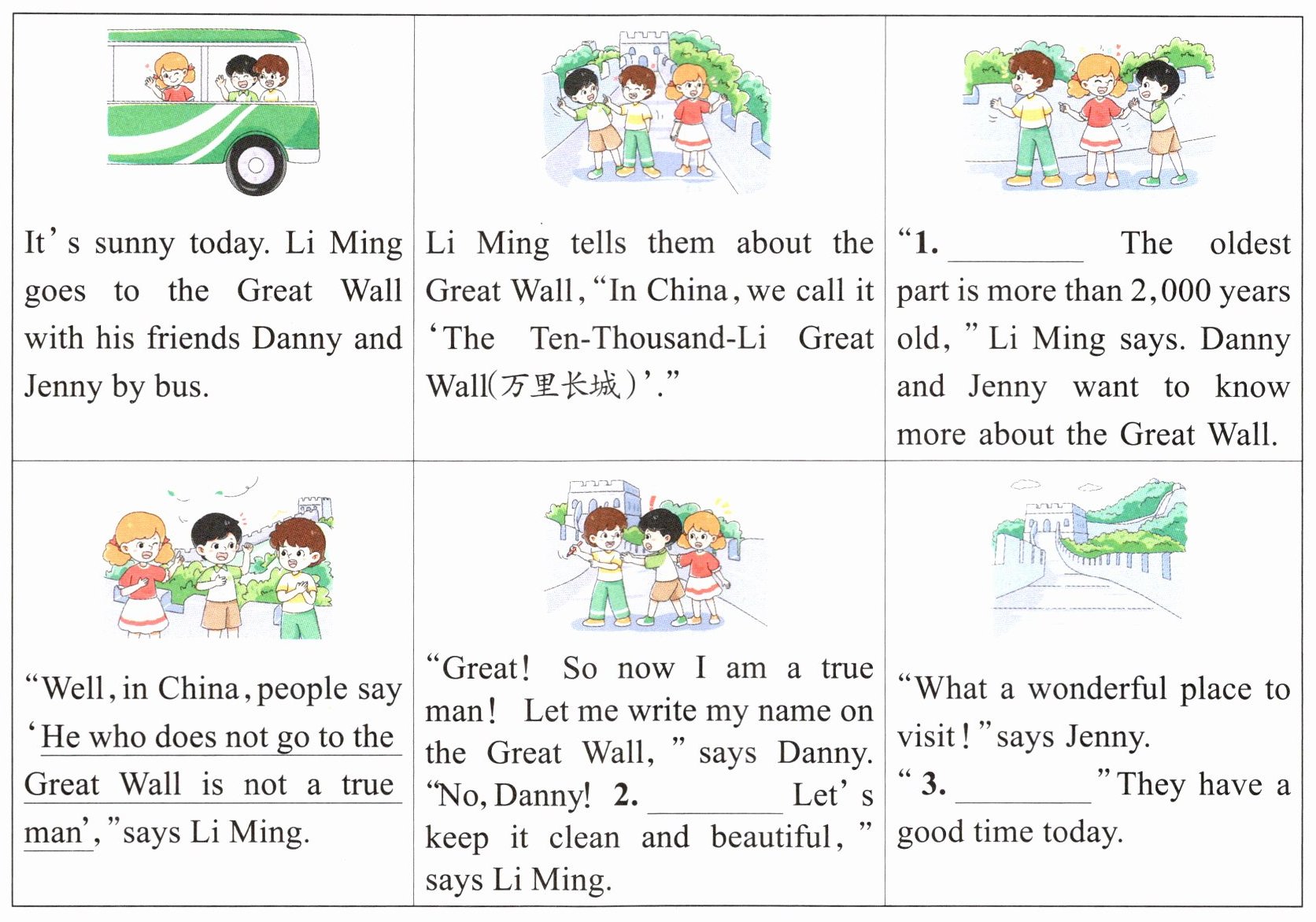 | "Well, in China, people say 'He who does not go to the Great Wall is not a true man'," says Li Ming. | "Great! So now I am a true man! Let me write my name on the Great Wall," says Danny. "No, Danny! 2. ______ Let's keep it clean and beautiful," says Li Ming. | "What a wonderful place to visit!" says Jenny. "3. ______" They have a good time today. |