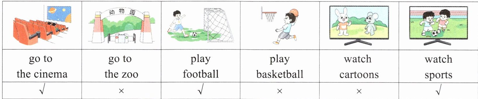 | go to the cinema | go to the zoo | play football | play basketball | watch cartoons | watch sports |