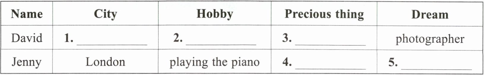 | Jenny | London | playing the piano | 4. ______ | 5. ______ |