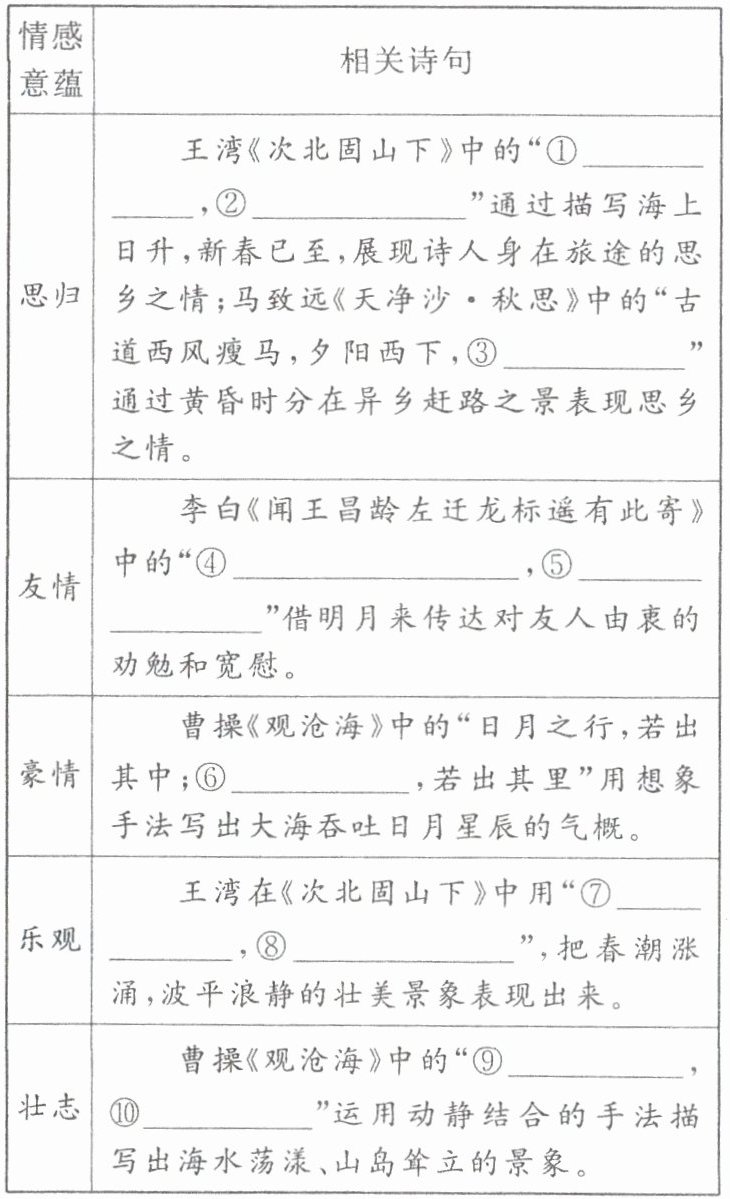 6. 诗人的笔是有生命的,自然万物一经诗歌浸润便有了情思,小凤和小语从背过的诗歌中理出了几个常见的情感,请你帮助他们将表格补充完整。(10 分)