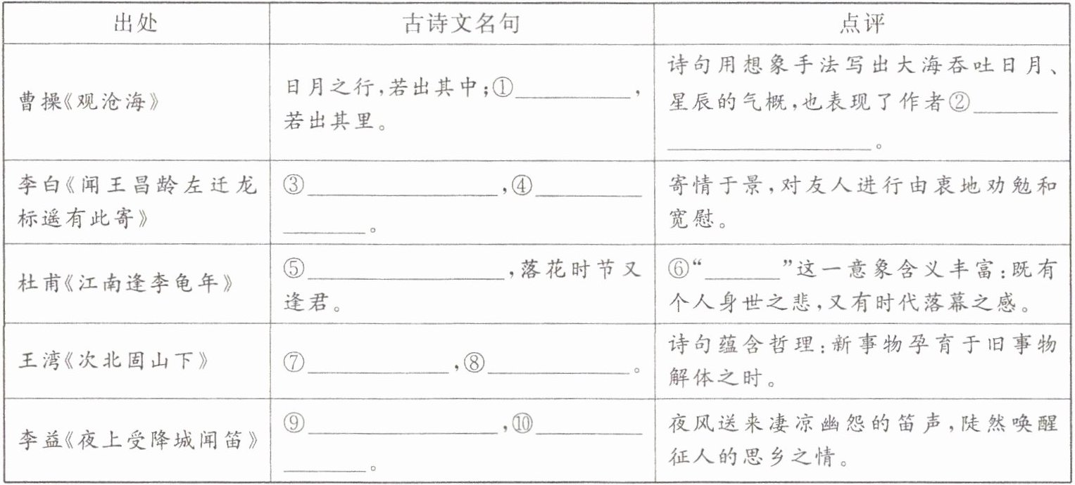 1.①星汉灿烂 ②远大的抱负(开阔的胸襟) ③我寄愁心与明月 ④随君直到夜郎西 ⑤正是江南好风景 ⑥落花 ⑦海日生残夜 ⑧江春入旧年 ⑨不知何处吹芦管 ⑩一夜征人尽望乡