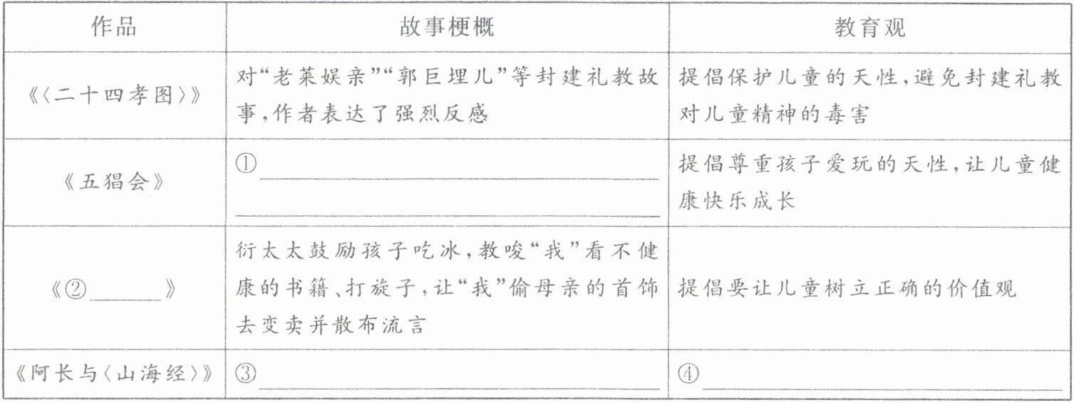(1)《朝花夕拾》中的许多故事,蕴含着作者对儿童教育问题的深层思考。请根据阅读体验按照要求填写下表。