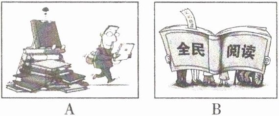 (3)示例一:我选A。漫画左边是一堆被闲置许久、已结出蜘蛛网的书籍,右侧是沉迷于移动设备,对身边的书籍视而不见的学生,它生动形象地揭示了当下学生对纸质书籍的冷落,选用此漫画,可以让大家认识到目前我们的阅读现状,引起反思,进而倡导阅读。示例二:我选B。漫画中,许多人一起阅读书籍,提高素养,它生动形象地写出了人们对阅读的重视,选用此漫画不但可以鼓励青少年多读一些有益的书,而且也有利于形成全民阅读的良好氛围,达到文化强国的目的。