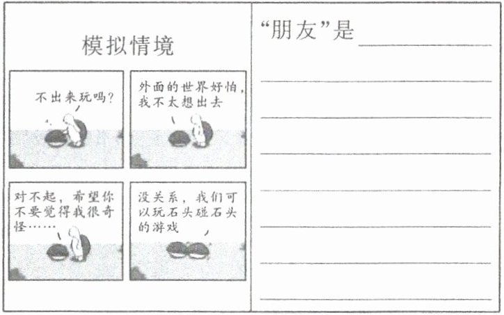 (2)在我们心情低落的时候,会给予我们鼓励和陪伴的人。朋友会给予我们耐心的聆听和支持,让我们感到被关心和被理解。(注意:对于朋友的内涵理解,要符合漫画内容的情节)