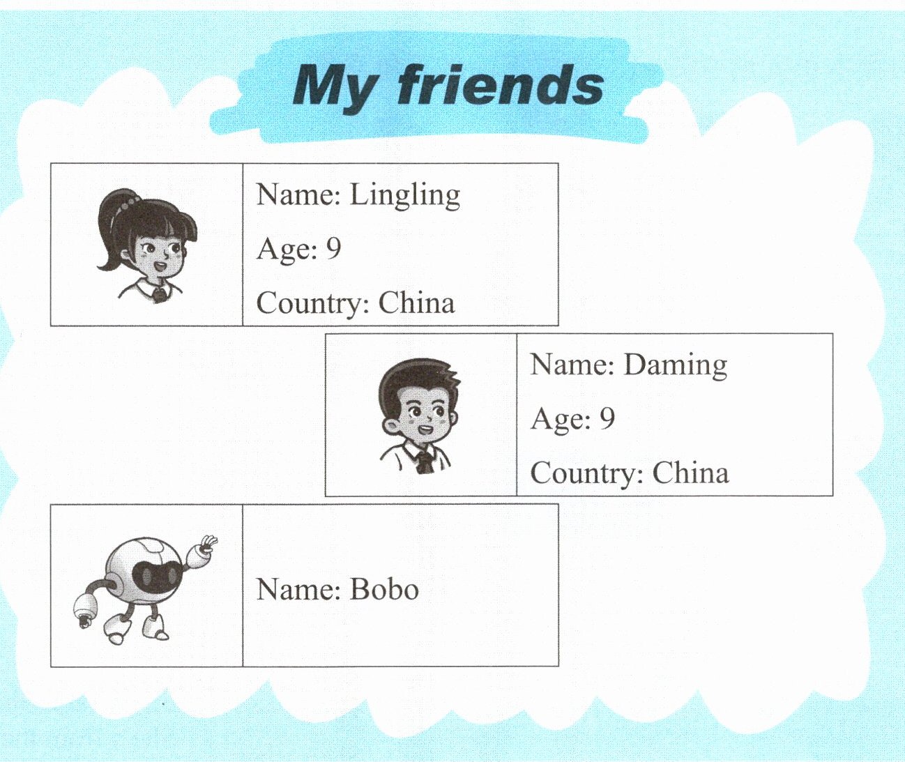 下面是Amy制作的关于她的朋友们的海报。请你根据海报信息,帮她完成对朋友们的介绍(每空一词)。