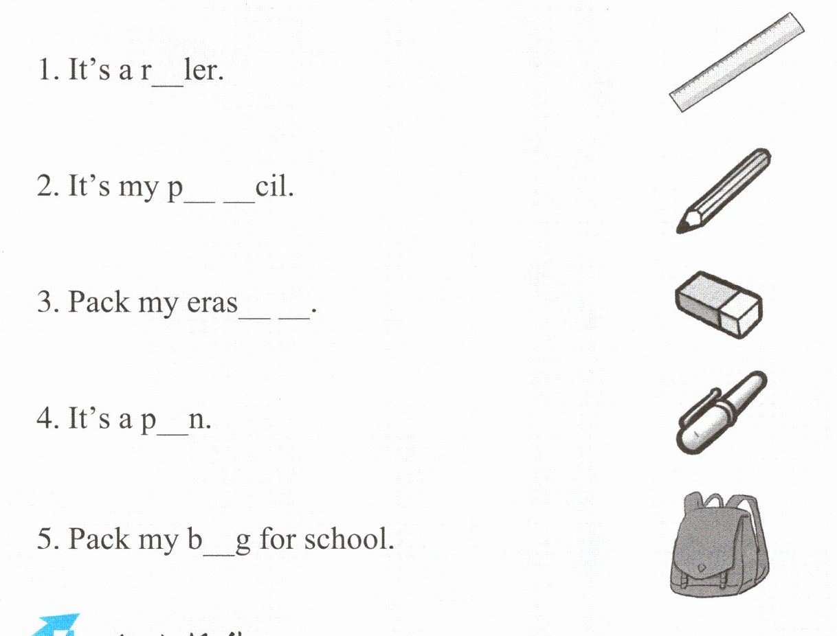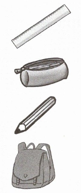 1. ruler 2. pencil 3. eraser 4. pen 5. bag