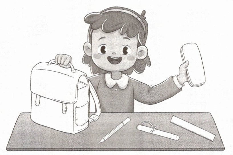 书包——蓝色的;尺子——黄色的;笔袋——绿色的;铅笔——橙色的;钢笔——黑色的