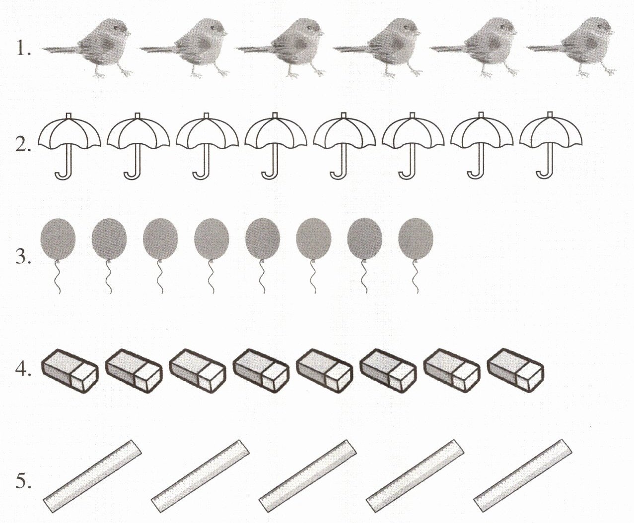 1. 三只小鸟 2. 五把雨伞 3. 七个气球 4. 八块橡皮 5. 一把尺子