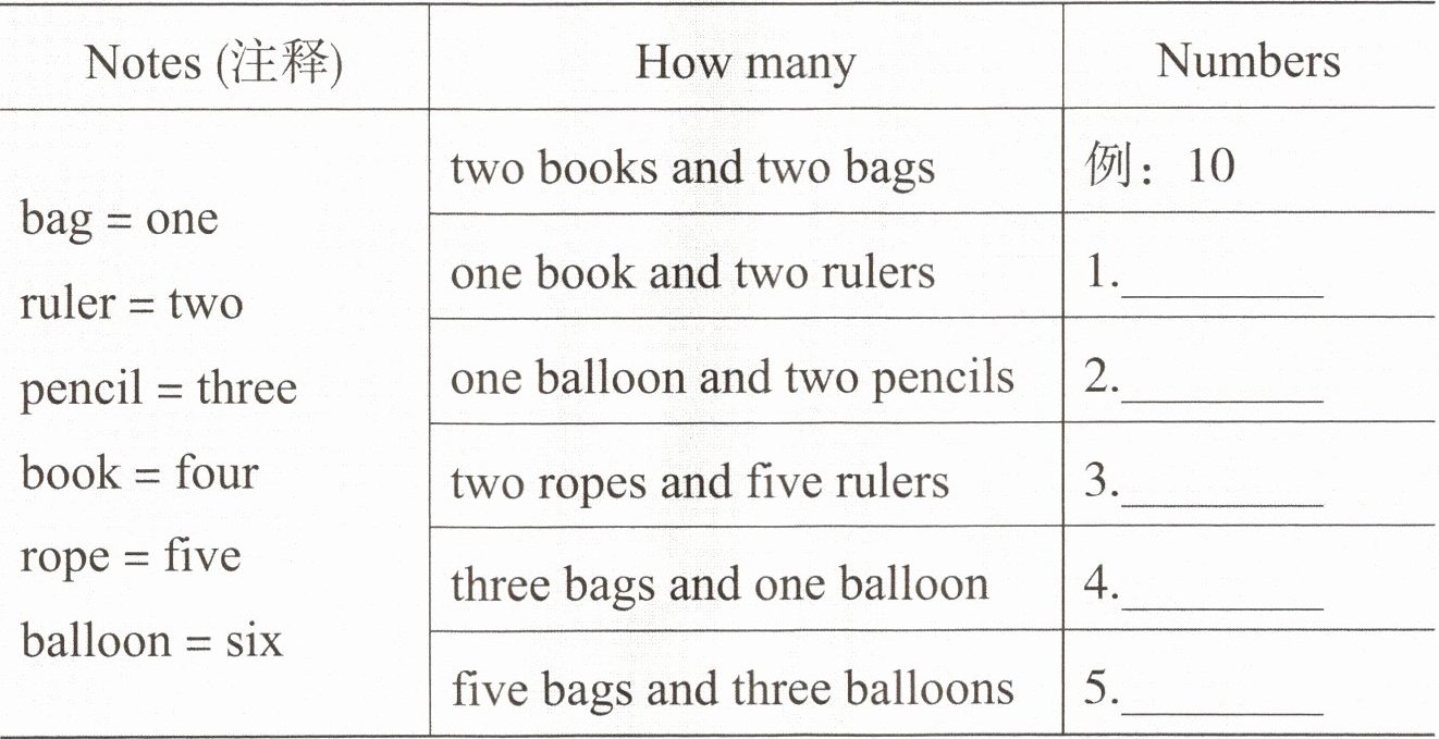 解析:三个包,每个包是1,所以三个包是 \( 3×1 = 3 \);一个气球是6,总共 \( 3 + 6 = 9 \)。