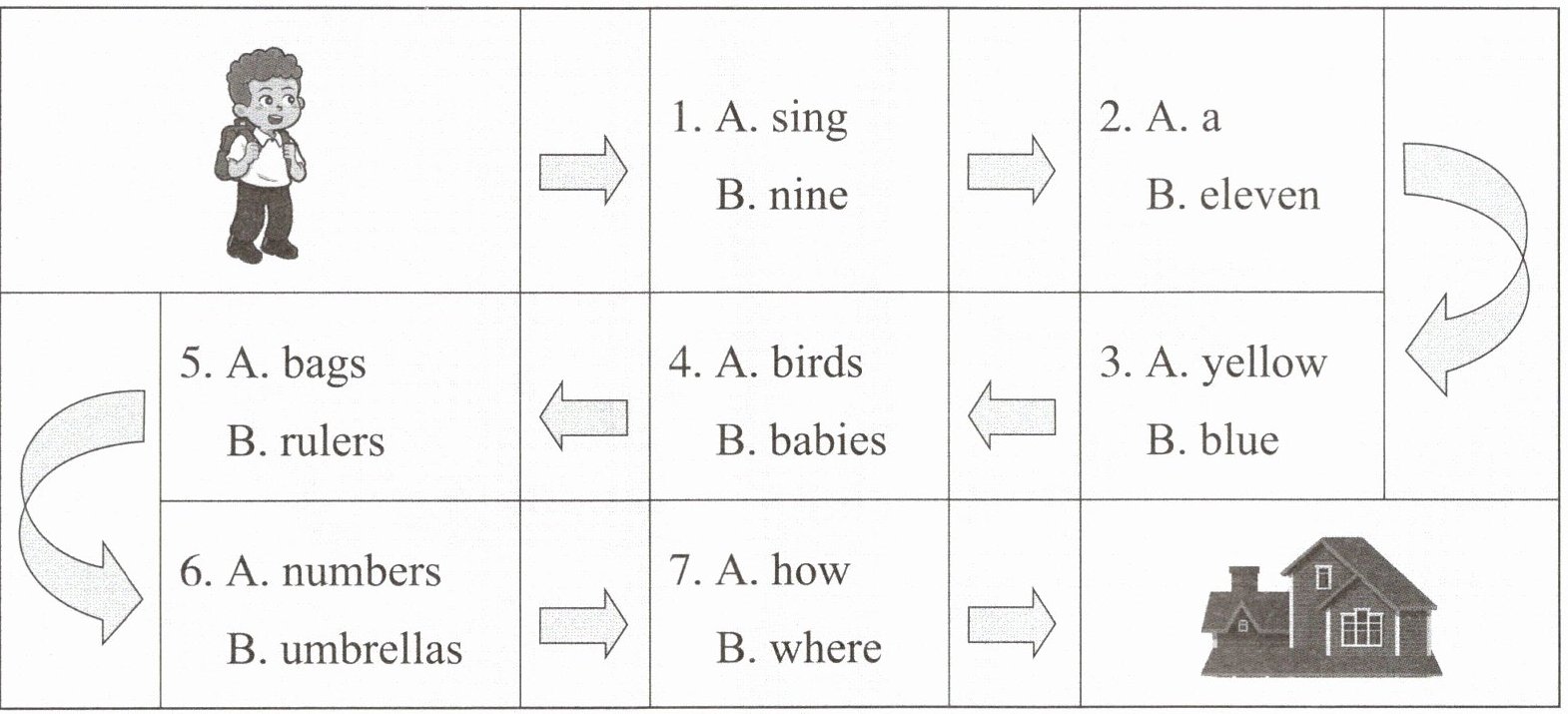 1 Listen and circle. 听录音,圈单词,帮 Sam 找到回家的路。