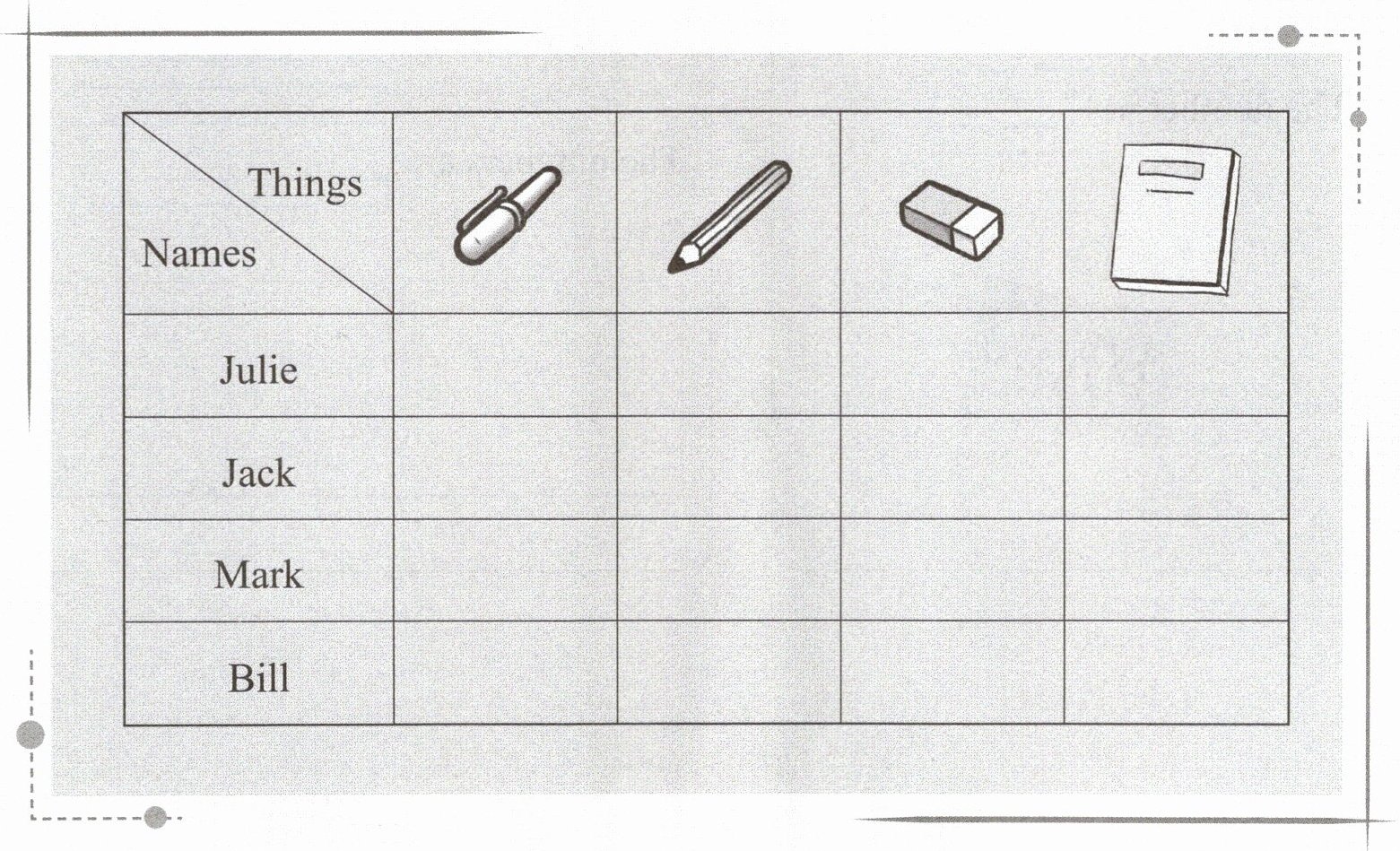 2 Listen and write. 听录音,在人物与对应的物品方框中写出物品的数量。