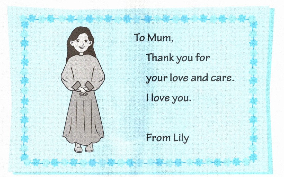 ● 下面是Lily为妈妈制作的贺卡,请你根据贺卡内容,帮她完成对贺卡的介绍。