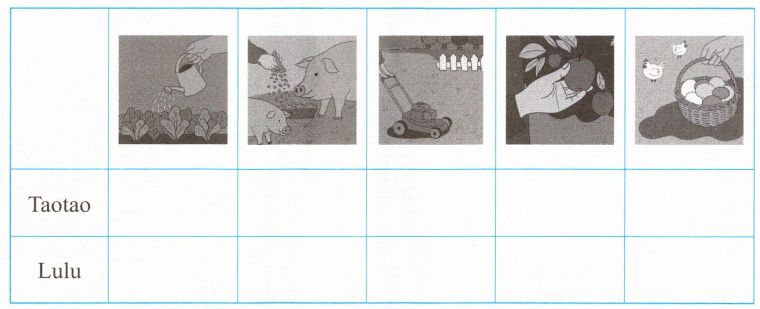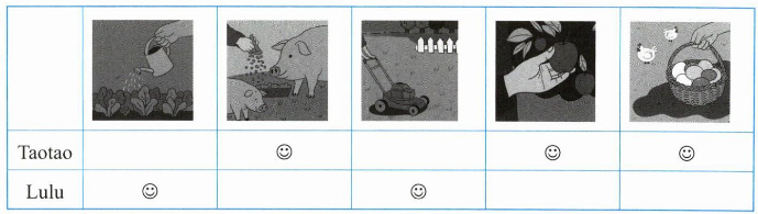 2 Listen and draw $\odot$. 听录音,在人物与对应的家务劳动方框中画$\odot$。