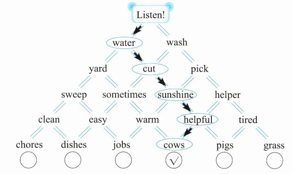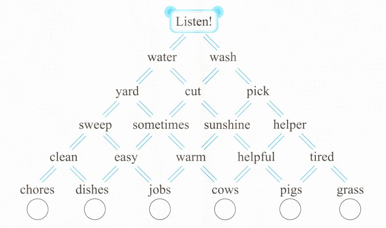 1 Listen, circle and write “√”. 听录音,圈单词,找到路线并在圆圈中打“√”。