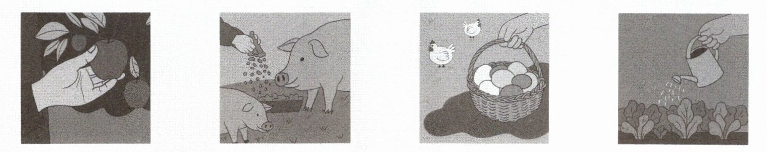 First, I get the eggs. Then, I pick the apples. After that, I water the vegetables. At last, I feed the pigs.