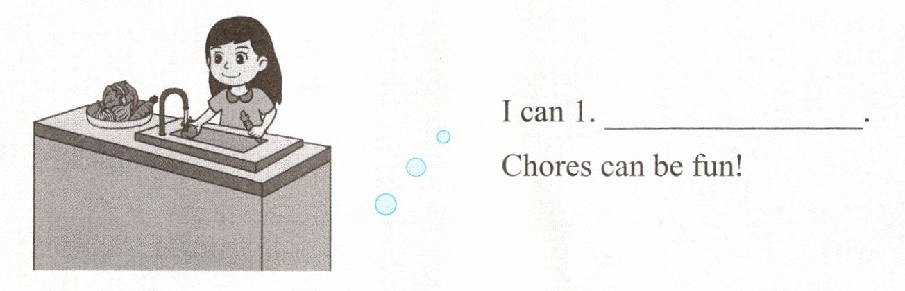 下面的小朋友都是“家务小帮手”,他们像阳光一样温暖了家人。他们分别记录了自己做家务的瞬间,请根据图片提示,帮他们完成介绍。