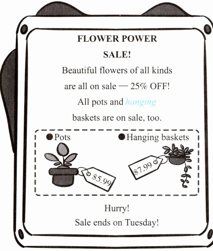 It’s the first season of the year. It is time to plant flowers. Christina and her dad are trying to decide what kind of flowers to plant this year. Her dad shows her an ad (广告) in the morning paper. He wants Christina to have a look at it and help him decide what to buy. They like to give a surprise to Christina’s mum with beautiful flowers before her “big day” in May. Christina is surprised to see Flower Power is having a sale (大减价). She knows they had better hurry to the shop.